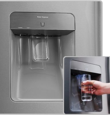 Orzeźwienie zawsze pod ręką Nie potrzebujesz dodatkowych, skomplikowanych instalacji, aby cieszyć się dostępem do świeżej, chłodnej wody. Wystarczy napełnić wbudowany pojemnik na wodę. Dzięki smukłej konstrukcji pojemnik zajmuje niewiele miejsca, a żeby napełnić szklankę nie musisz nawet otwierać drzwi lodówki, dlatego oszczędzasz czas i pieniądze. |