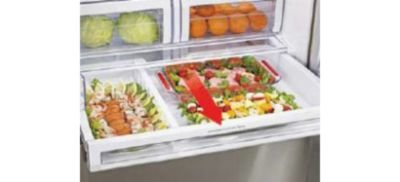| Lodówka w lodówce Wszechstronny zamykany schowek CoolSelect PantryTM umożliwia wybór temperatury po naciśnięciu przycisku, w zależności od rodzaju przechowywanej żywności. |