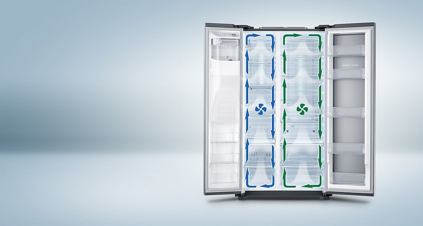 Z myślą o lepszym chłodzeniu Technologia chłodzenia Twin Cooling Plus™ umożliwia niezależne schładzanie komór chłodziarki i zamrażarki, dzięki czemu jedzenie pozostaje dłużej świeże, a zapachy się nie mieszają. Niezależne systemy chłodzenia zapewniają optymalną wilgotność. Żywność pozostaje świeża na dłużej. |
