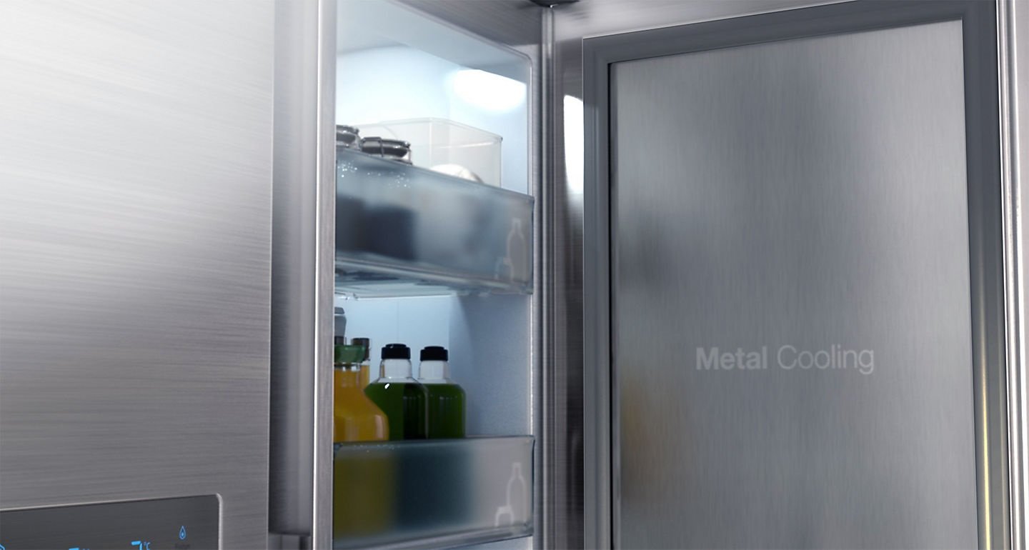 | Zatrzymuje chłodne powietrze Metalowa osłona chłodząca lodówki Samsung Food Showcase pomaga utrzymać optymalną temperaturę wewnątrz urządzenia, dzięki czemu żywność pozostaje świeża, nawet przy częstym otwieraniu i zamykaniu drzwi komory ShowCase. |