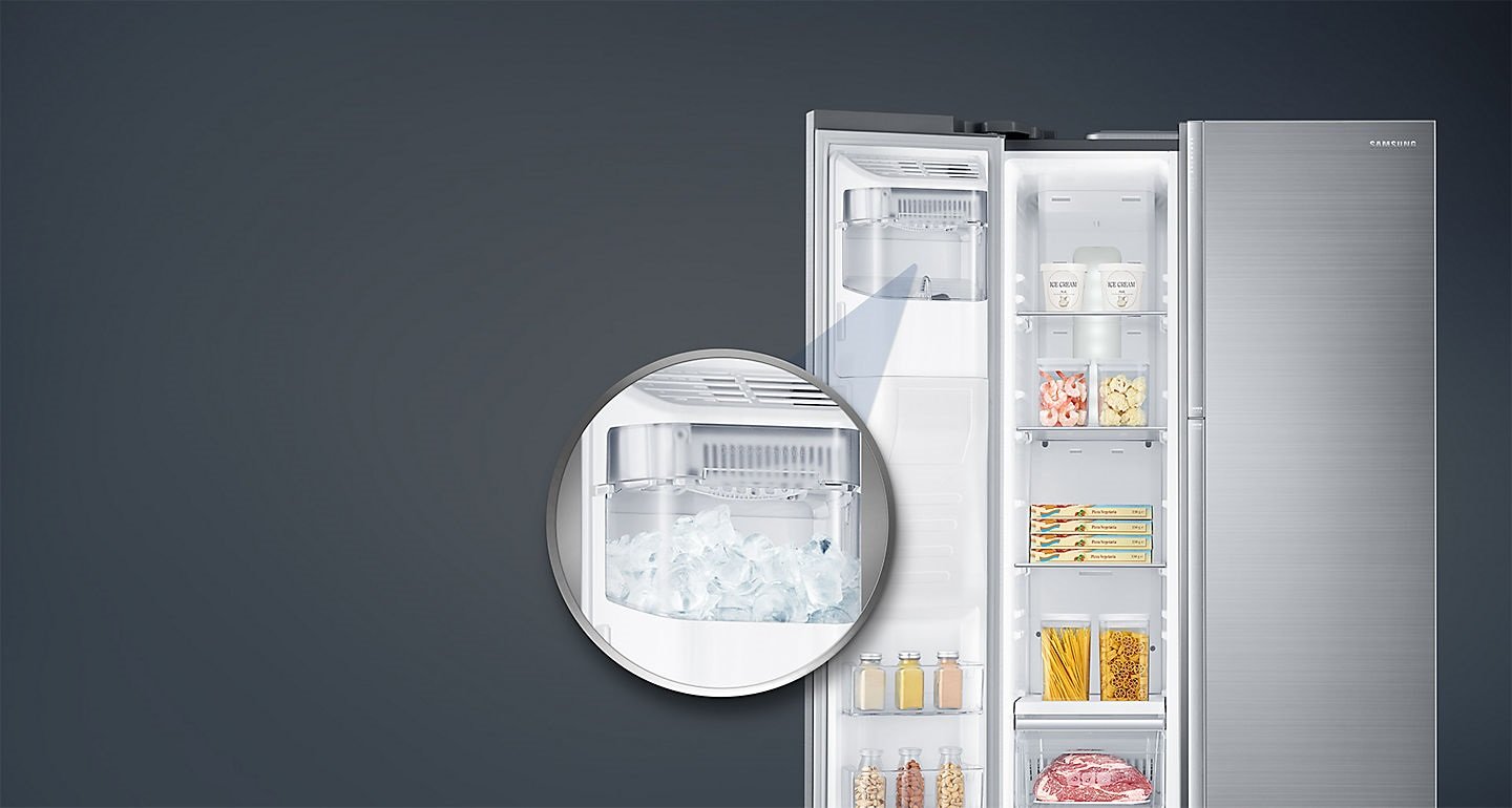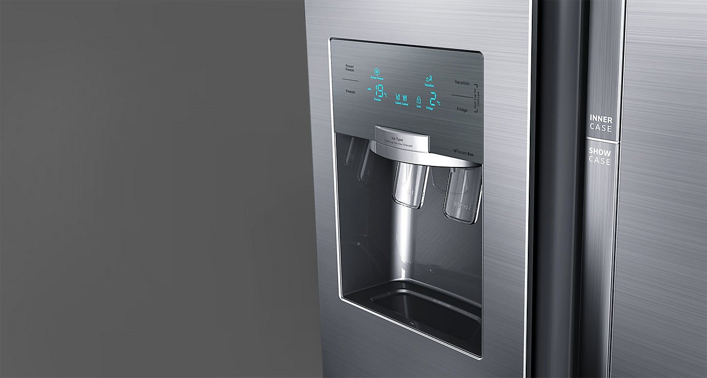 | Dozownik lodu i wody Dozownik lodu i wody w lodówce Samsung Food Showcase to prosty sposób na orzeźwienie. Jest elegancko wykończony elementami ze stali nierdzewnej i ma atrakcyjny wyświetlacz w kolorze chłodnego błękitu. Za jednym naciśnięciem przycisku możesz nalać sobie chłodnej filtrowanej wody lub napełnić pojemnik lodem kruszonym lub w wkostkach. |