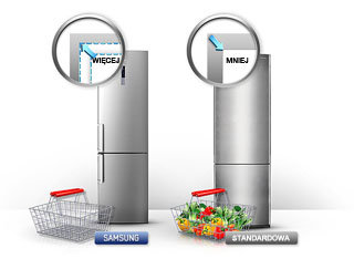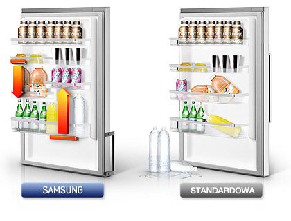 Pojemność lodówki jest znacznie większa i ergonomiczniej rozplanowana niż produkty konkurencji. Cztery warstwowe szuflady zapewniają więcej miejsca dla różnych rodzajów żywności. W zależności od opcji można wybrać kostkarkę do lodu lub tacę na lód.