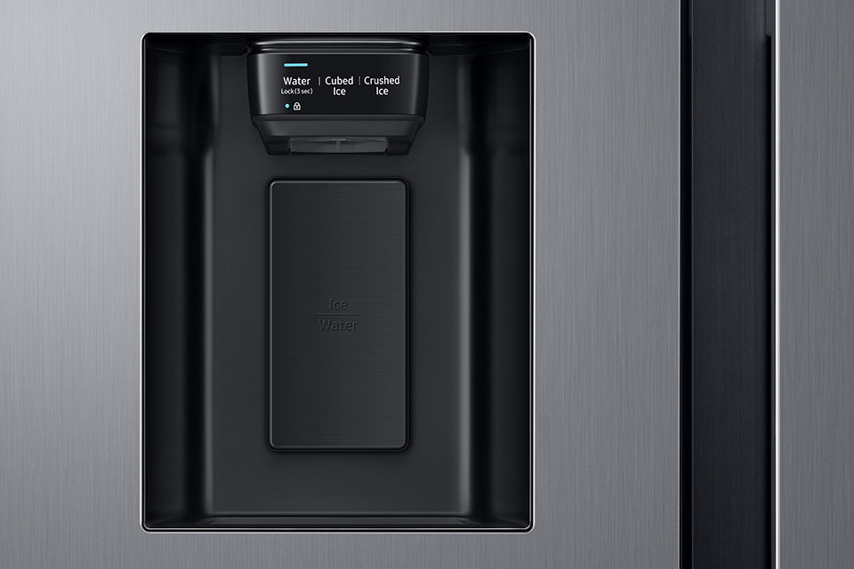 Świeża, schłodzona woda w zasięgu ręki. Nie trzeba otwierać drzwi chłodziarki, aby po nią sięgnąć. Kostkarka od wewnątrz urządzenia jest przezroczysta, dlatego zawsze widać, ile jest lodu.