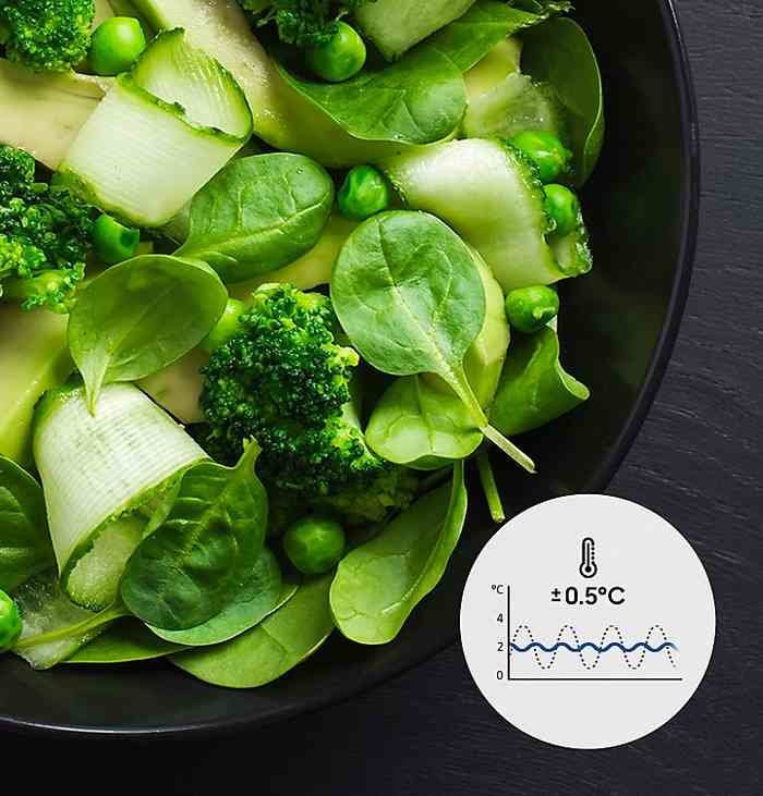 Niezawodna świeżość Zachowaj świeżość, aromat i teksturę żywności przez dłuższy czas. Kompresor Digital Inverter dostosowuje prędkość pracy tak, aby maksymalnie ograniczyć wahania temperatury do ±0,5°C. |
