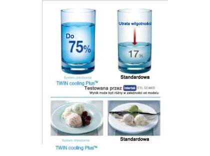 Zanim pójdziesz na zakupy, powinieneś zastanowić się, jak długo możesz przechowywać żywność w swojej lodówce. Czy żywność w lodówce jest świeża przez długi okres czasu? Jak długi jest ten okres? Czy w lodówce nie będą rozwijać się organizmy chorobotwórcze? Czy jedzenie będzie miało równie dobry smak po kilku dniach? Tak, dzięki innowacyjnemu systemowi chłodzenia SAMSUNG TWIN Cooling Plus™, który zapewnia oddzielną cyrkulację powietrza w lodówce i zamrażarce oraz kieruje chłodne powietrze tam, gdzie jest potrzebne. Lodówki SAMSUNG utrzymują wilgotność przechowywanej żywności do 75%, dzięki czemu owoce i warzywa zachowują naturalną wilgotność. Oddzielna cyrkulacja powietrza powoduje, że zapachy się nie przenikają i jedzenie smakuje w odpowiedni sposób. Co więcej, w lodówce nie osadza się lód.