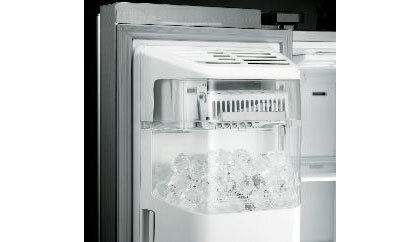 Umieszczenie kostkarki do lodu na drzwiach zamrażarki oszczędza miejsce w samej zamrażarce i zwiększa wydajność kostkarki.