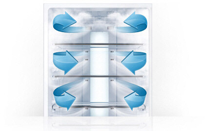 Zimne powietrze dostaje się do wnętrza lodówki przez wiele otworów umieszczonych na poziomie każdej półki, zapewniając stabilne i równomierne chłodzenie w całej lodówce. System Multi Flow przyspiesza również powrót do prawidłowej temperatury po otwarciu drzwi lodówki, w efekcie przedłużając czas bezpiecznego przechowywania żywności.