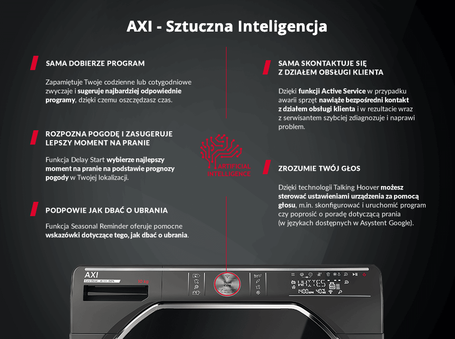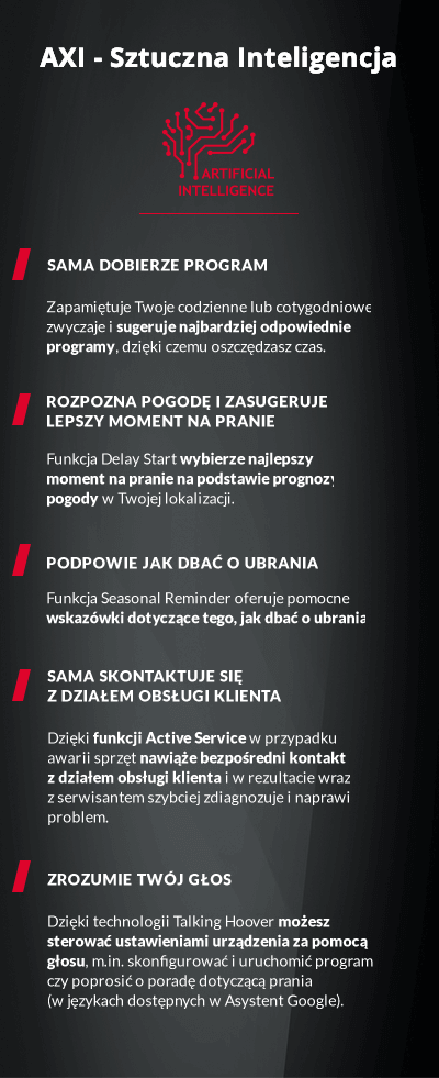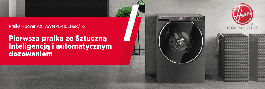 Hoover AXI to pierwsze rewolucyjne urządzenie wyposażone w Sztuczną Inteligencję, które podpowiada, przewiduje, pielęgnuje i automatycznie dozuje detergenty. Pralką Hoover AXI możesz też sterować i sprawdzać stan techniczny za pomocą aplikacji Hoover Wizard App. Przekonaj się, jak AXI zmieni Twoje podejście do codziennych obowiązków!
