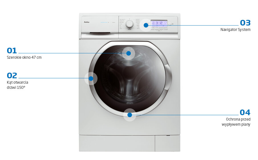 Funkcjonalności pralek Amica są teraz na wyciągnięcie ręki. Ich wykorzystanie nie jest trudne, bo przez ich możliwości przeprowadzi Cię System Navigator. Intuicyjne sterowanie od lewej do prawej pomoże Ci zapomnieć o instrukcji obsługi - teraz wszystkiego dowiesz się korzystając z samej pralki.
