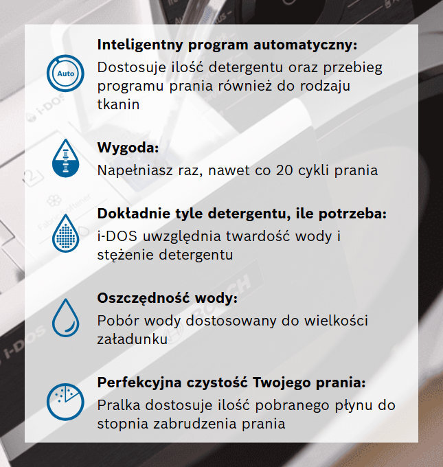 Odkryj wygodny sposób na oszczędność wody, płynów do prania i płukania. Pralka Bosch i-DOS pobierze w każdym cyklu tylko tyle detergentu, ile potrzeba. i-DOS uwzględni wielkość załadunku, stopień zabrudzenia, a nawet twardość wody!
