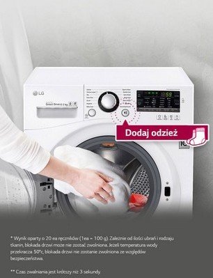 Jeśli zapomnisz włożyć artykuł do prania, po prostu naciśnij przycisk „Dodaj odzież” i dodaj co chcesz, od skarpetek po kurtkę. Drzwiczki można otworzyć podczas prania w każdym programie — bawełna, mieszany, tkaniny mało wymagające, Speed14* — prawie natychmiast (w ciągu około 3 sekund)**.