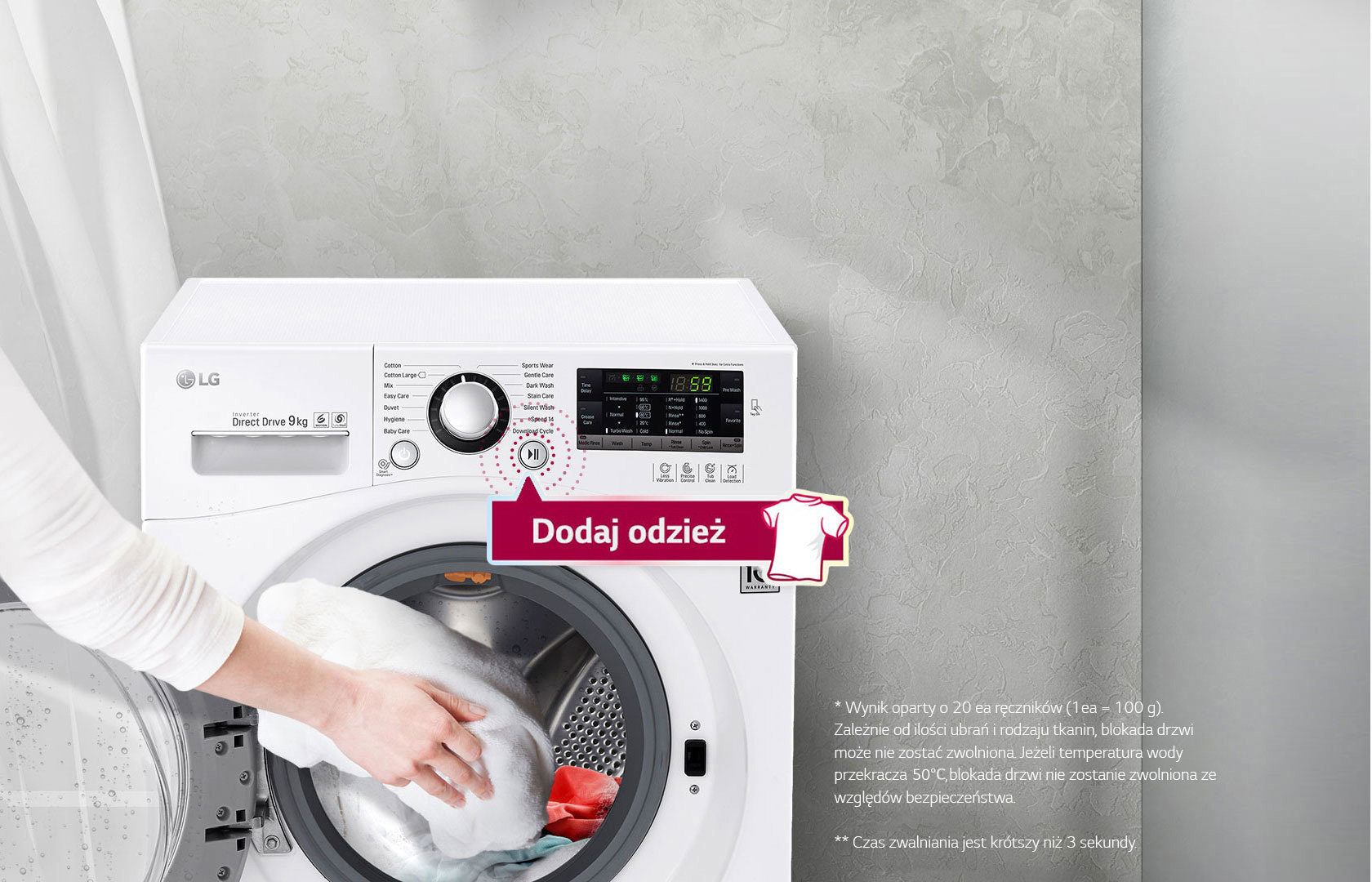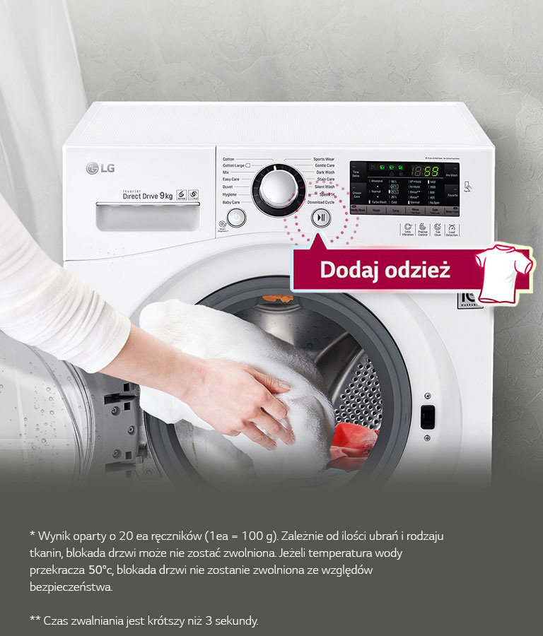 Jeśli zapomnisz włożyć czegoś do prania, po prostu naciśnij przycisk „Dodaj odzież” i dodaj co chcesz, od skarpetek po kurtkę. Drzwiczki można otworzyć podczas prania w każdym programie — bawełna, mieszany, tkaniny mało wymagające, Speed14* — prawie natychmiast (w ciągu około 3 sekund)**.