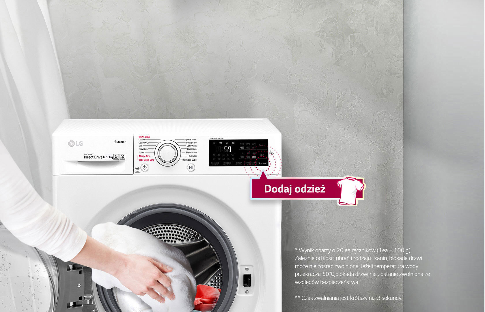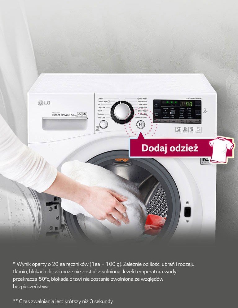 Jeśli zapomnisz włożyć artykuł do prania, po prostu naciśnij przycisk „Dodaj odzież” i dodaj co chcesz, od skarpetek po kurtkę. Drzwiczki można otworzyć podczas prania w każdym programie — bawełna, mieszany, tkaniny mało wymagające, Speed14* — prawie natychmiast (w ciągu około 3 sekund)**.
