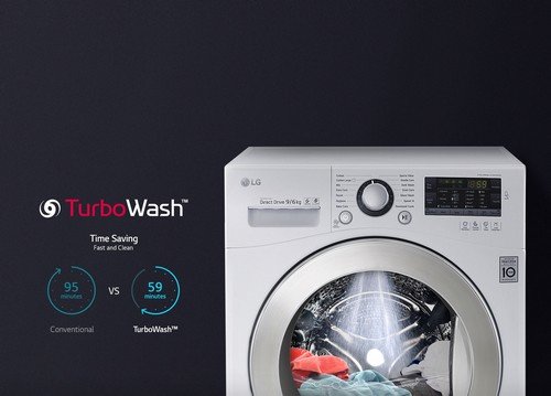 SZYBKIE I OSZCZĘDNE dzięki funkcji Turbowash™ Funkcja natrysku wodnego TurboWash™ znacznie ogranicza czas prania, oszczędza mnóstwo energii i zapewnia dokładniejsze pranie ubrań. Natrysk wodny działa bezpośrednio na tkaninę przez około 120 sekund, dzięki czemu cykle prania i płukania z napędem bezpośrednim 6 Motion są skuteczniejsze niż kiedykolwiek wcześniej. |