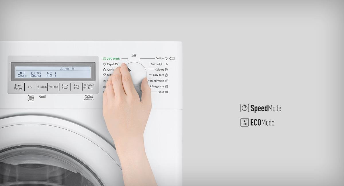 Możliwość wyboru między trybami Eco i Speed pozwala dopasować pranie do własnego stylu życia. Tryb Speed pozwala skrócić czas prania nawet o 40% w porównaniu z cyklem standardowym, natomiast pranie w trybie Eco zajmuje więcej czasu niż zwykłe, ale pozwala zaoszczędzić sporą ilość energii, wody i pieniędzy.