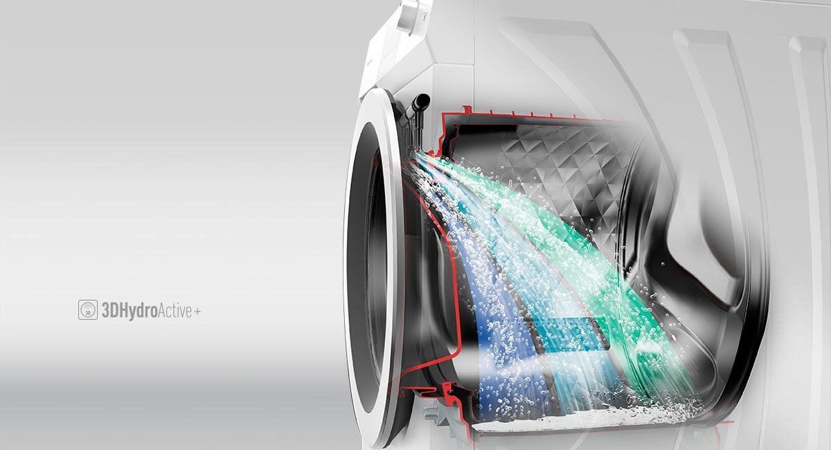 Praca systemu 3D HydroActive+ polega na wtryskiwaniu detergentu i wody przez trzy dysze głęboko do bębna, równym namaczaniu ubrań w celu jak najszybszego rozpoczęcia usuwania brudu. Dzięki temu pranie trwa o wiele krócej a każdy jego cykl cechuje większa dokładność oraz dokładniejsze płukanie.