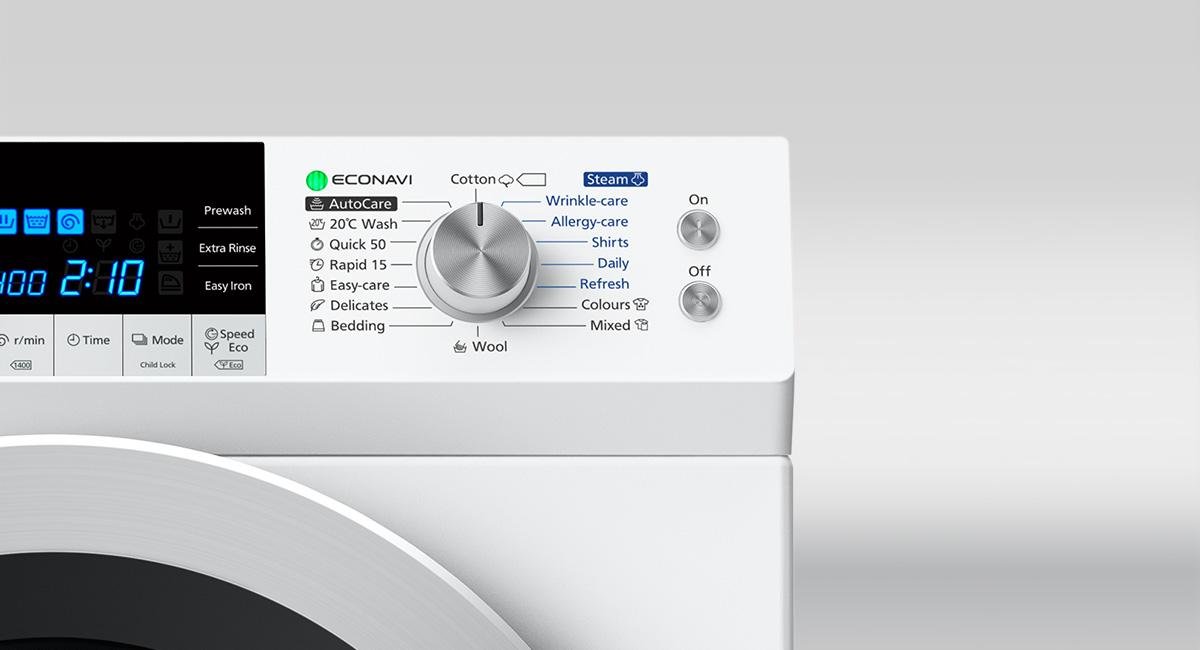 Funkcja AutoCare to program, który automatycznie dopasowuje się do Twojego prania już do dotknięciu przycisku. W ramach funkcji AutoCare wykorzystywane są cztery inteligentne czujniki ECONAVI, dzięki którym możliwe jest wykrycie wielkości wsadu, stopnia zabrudzenia, rodzaju materiałów oraz optymalne dobranie idealnej temperatury wody, czasu namaczania i cyklu wirowania w celu zapewnienia doskonałych wyników.