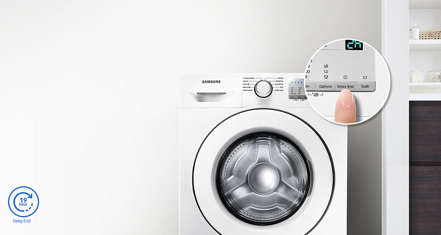 | Ustaw czas zakończenia prania Funkcja Opóźnionego Zakończenia pozwoli Ci zaprogramować czas zakończenia danego cyklu. Może być ustawiony i opóźniony nawet o 19 godzin, by wilgotne ubrania nie przebywały w pralce zbyt długo. |
