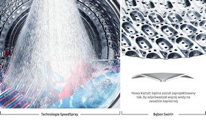 Rewolucyjna technologia QuickDrive™ - Idealnie czyste pranie nawet o połowę szybciej QuickDrive™ to innowacyjna technologia, dzięki której skrócisz czas prania nawet do 50%, a zużycie energii zmniejszysz do 20%, bez obniżenia skuteczności prania. Wyjątkowy bęben QuickDrive™ zbudowany jest z głównego bębna i pulsatora – niezależnie obracającej się płyty tylnej. Pranie porusza się w różnych kierunkach, dzięki temu zabrudzenia są usuwane szybciej i skuteczniej. Specjalnie wyprofilowany bęben i dodatkowa dysza skracają czas płukania oraz wirowania, gwarantując ochronę tkanin i kolorów. |
