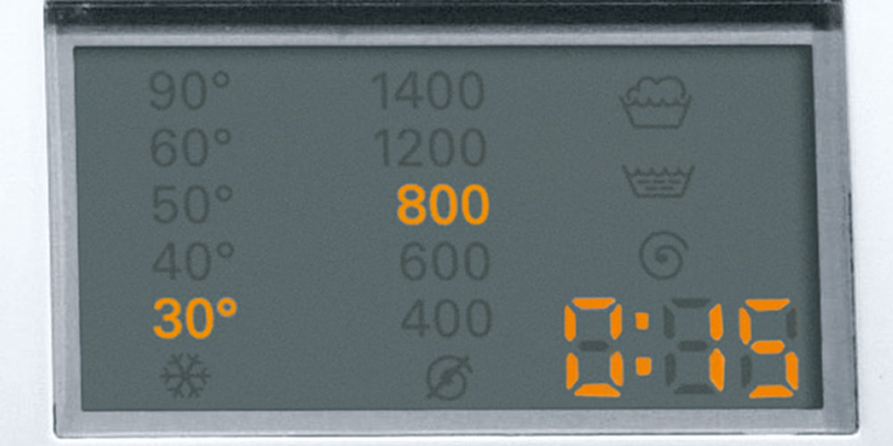 Najnowszej generacji wyświetlacz diodowy LED zawiera informacje o cyklu prania, czasie do jego zakończenia, ustawionej temperaturze, obrotach i wielu innych parametrach. Jego kontrastowa kolorystyka w stosunku do tła pozwala odczytać informacje nawet przy wyłączonym świetle.