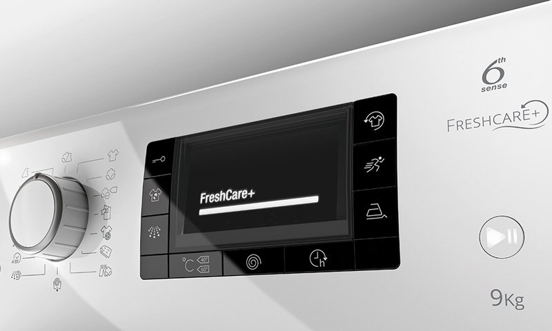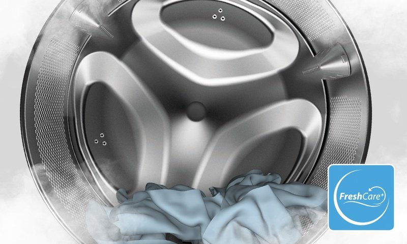 Technologia FreshCare+ to połączenie delikatnych ruchów bębna i strumieniom pary, dzięki którym powietrze wewnątrz bębna nieustannie krąży, zapewniając tkaninom odpowiednią wilgotność i niwelując ryzyko powstania brzydkich zapachów. Funkcję FreshCare+ możesz włączyć podczas wybierania programu, jak i podczas cyklu prania.