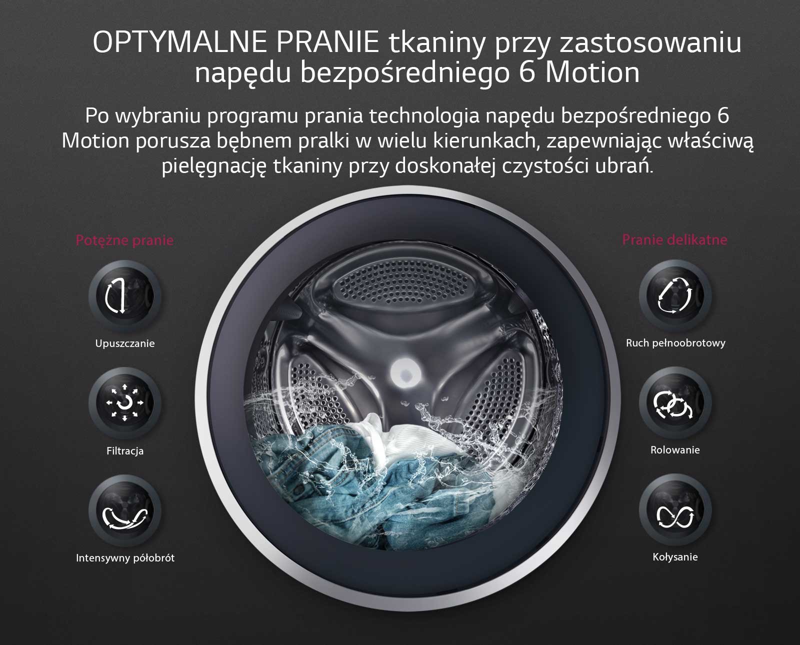 Optymalne pranie tkanin Po wybraniu programu prania technologia napędu bezpośredniego 6 Motion porusza bębnem pralki w wielu kierunkach, zapewniając właściwą pielęgnację tkaniny przy doskonałej czystości ubrań. |