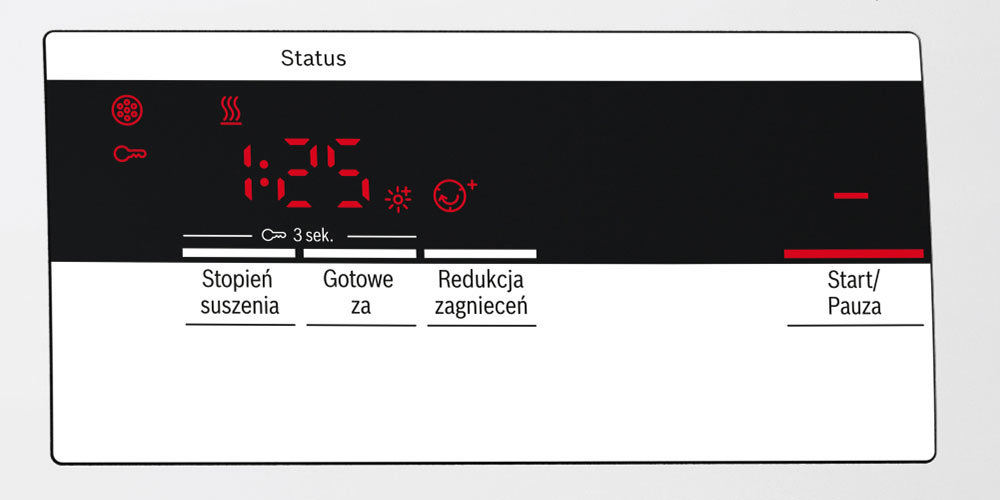 Wyświetlacz LED wykorzystywany w suszarkach matki Bosch pozwala w bardzo łatwy sposób sprawdzić status urządzenia oraz czas pozostały do końca wybranego programu.
