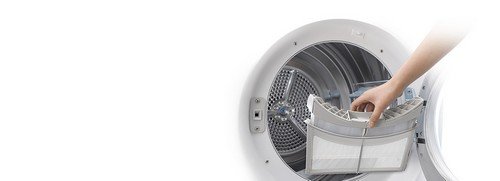 | Zawsze zachowuj czystość Podwójny filtr pozwala suszarce utrzymać wysoką sprawność suszenia dzięki odfiltrowywaniu kłaczków z ubrań. |