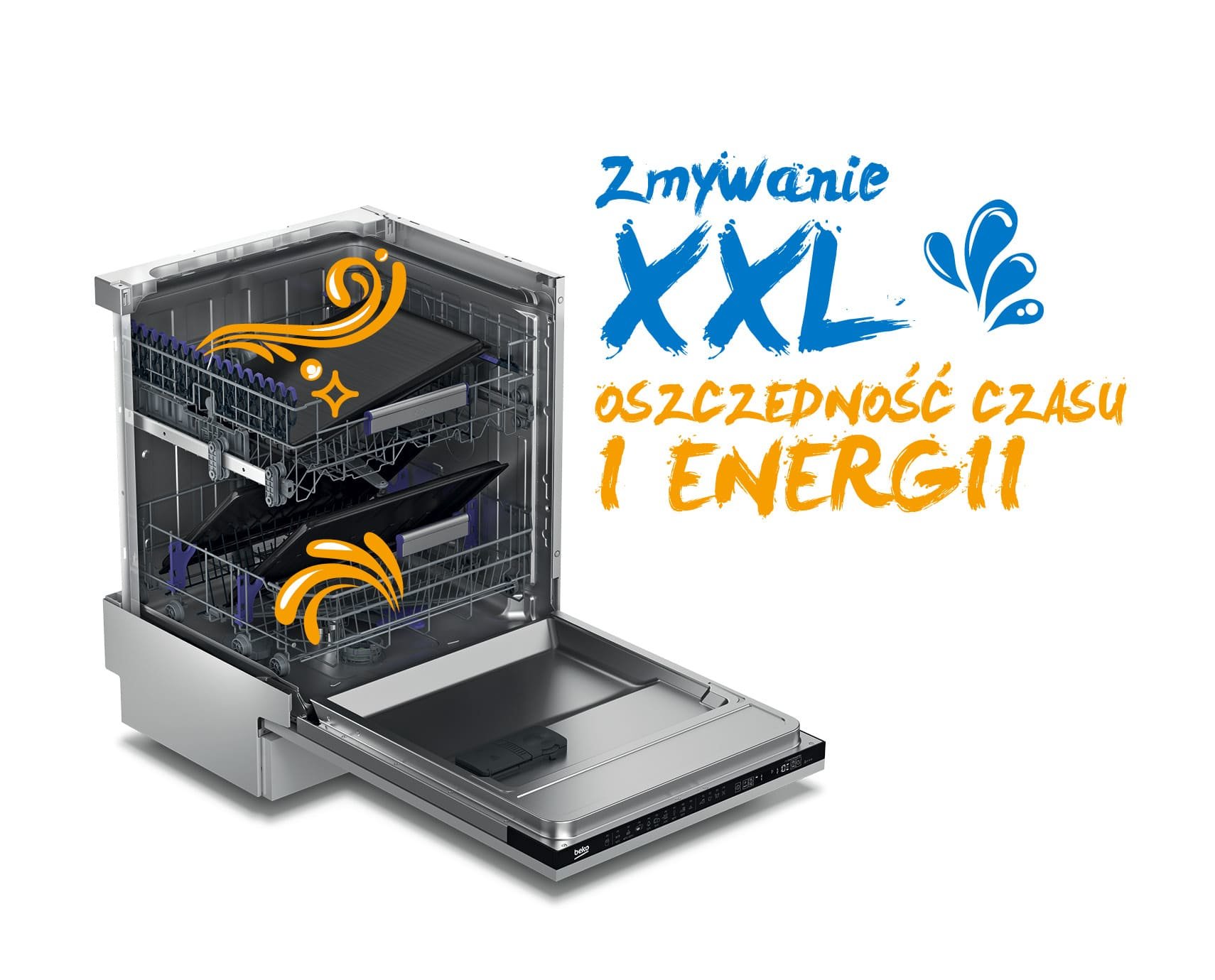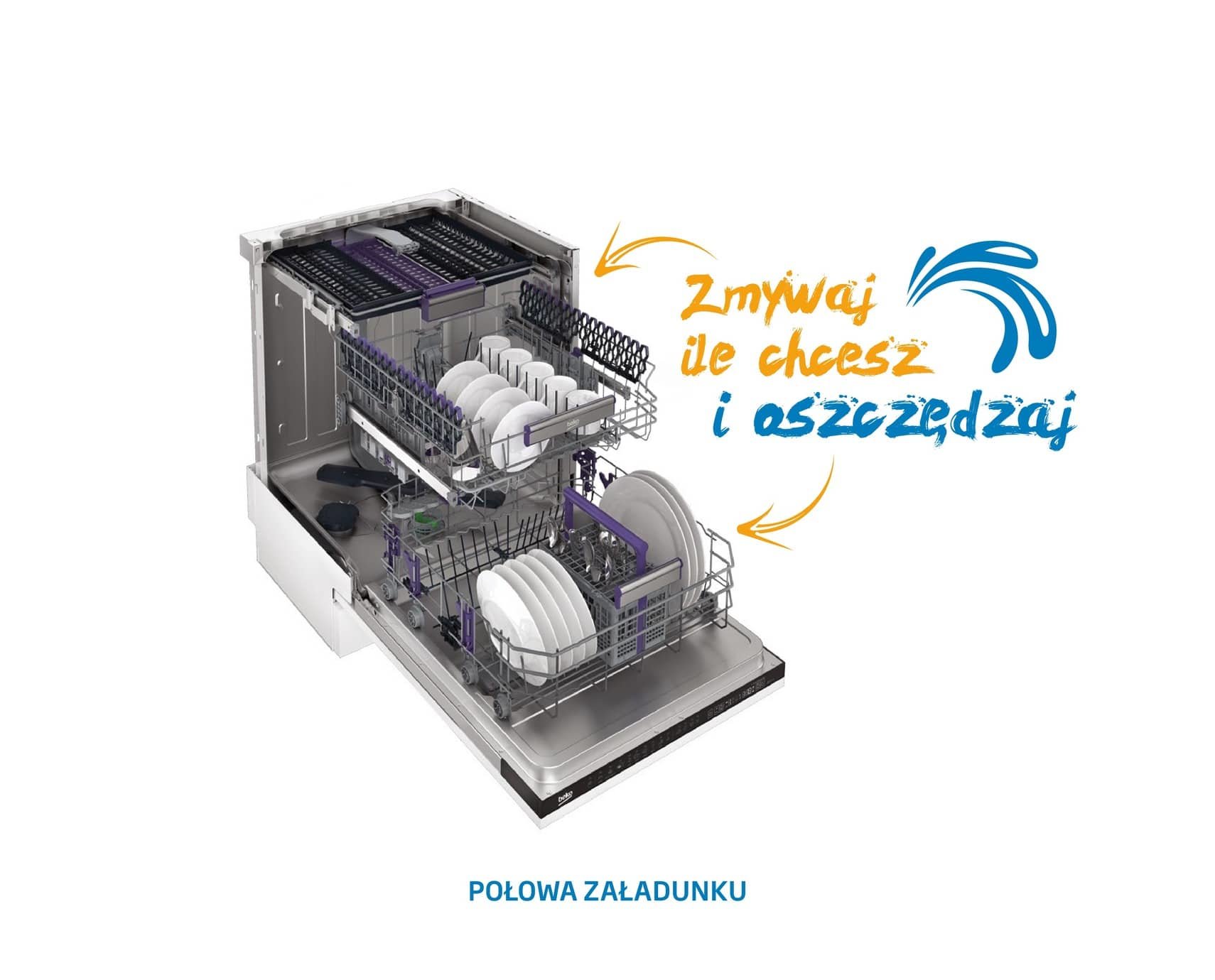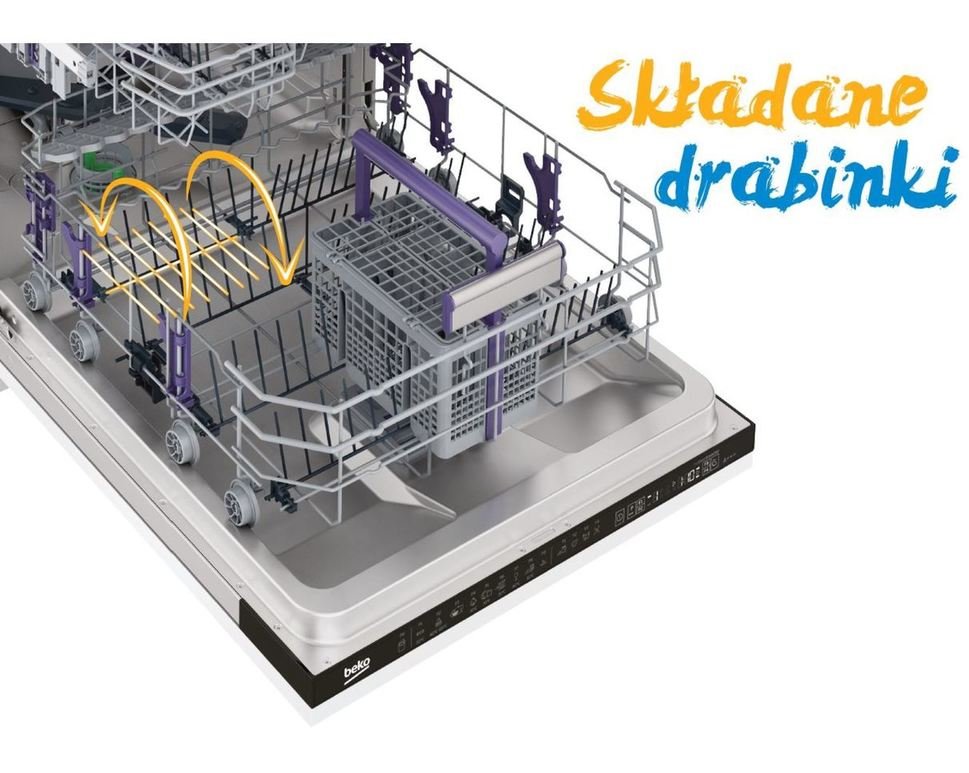 Kosze Modułowe Dzięki składanym drabinkom i możliwości regulacji bocznych półek w zmywarce Beko zmieścisz więcej kompletów naczyń, niezależnie od ich wielkości o kształtu. Elastyczność w dostosowaniu przestrzeni pomaga uniknąć sytuacji, w której zamiast dopełnić zmywarkę brudnymi naczyniami jesteśmy zmuszeni czekać do następnego cyklu nie wykorzystując wolnego miejsca w koszach. |