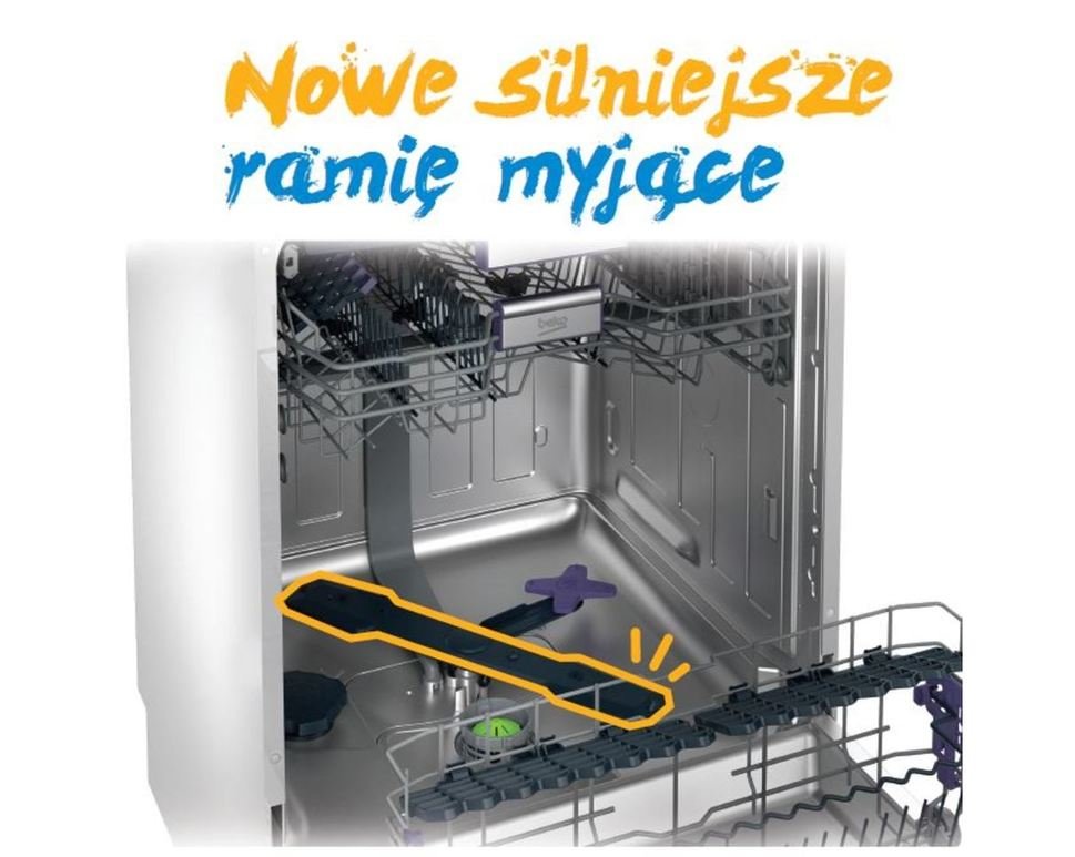 | Mocne ramię myjące Wzmocnione ramię myjące w zmywarkach Beko skuteczniej rozprowadza wodę po wnętrzu urządzenia i dociera do wszystkich zakamarków radząc sobie z najbrudniejszymi naczyniami. |