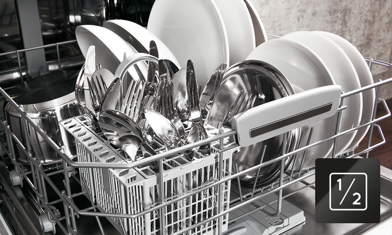 Już nie musisz czekać, aż brudne naczynia wypełnią cała zmywarkę. Dzięki programowi Połowa Załadunku możesz rozpocząć zmywanie nawet w przypadku niewielkiej ilości naczyń. Załaduj jedynie górny lub dolny kosz i oszczędzaj energię elektryczną, wodę, a także czas pracy zmywarki.