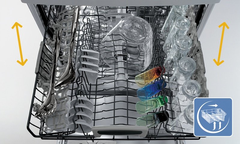 Kiedy po dużym rodzinnym obiedzie w Twojej zmywarce zaczyna brakować miejsca na brudne naczynia, skorzystaj z funkcji regulacji górnego kosza dzięki czemu zyskasz dodatkową przestrzeń.