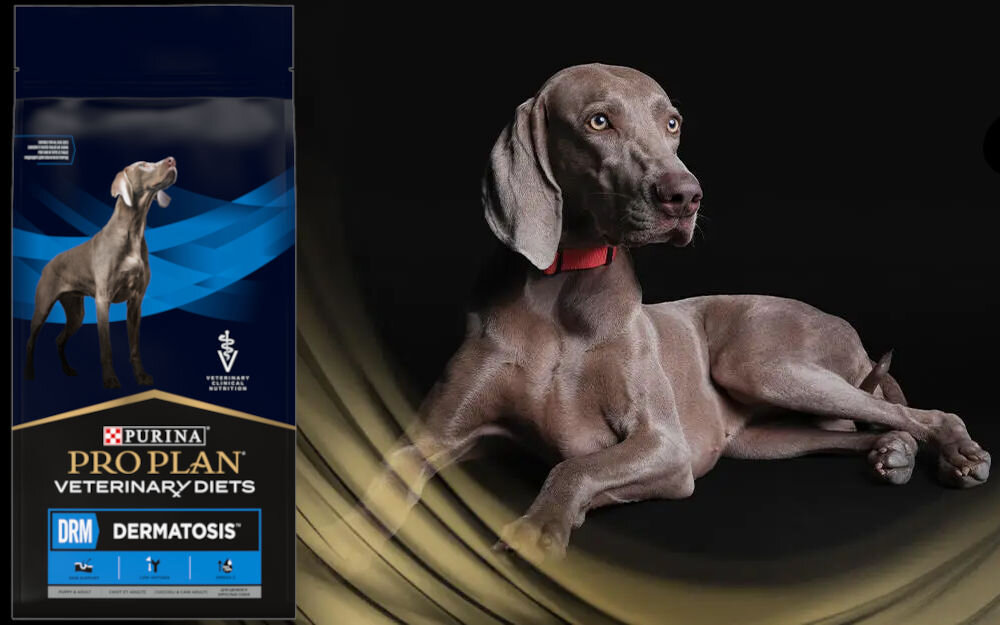 PURINA® PRO PLAN® VETERINARY DIETS Canine DRM Dermatosis™ to smaczna sucha karma dietetyczna stworzona z myślą o psach z dermatozami i nadmiernym wypadaniem sierści. Formuła tej karmy zawiera ograniczoną liczbę źródeł białka, co ma na celu zminimalizowanie ryzyka alergii. Karma ma zwiększoną zawartość niezbędnych kwasów tłuszczowych, które wspierają naturalną funkcję barierową skóry, a inne cenne składniki, w tym aminokwasy biorące udział w tworzeniu kolagenu, dostarczają kompleksowego wsparcia dla skóry i sierści psa.