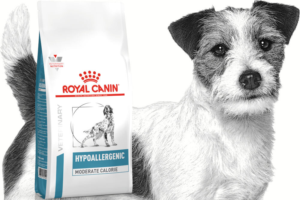 ROYAL CANIN® Hypoallergenic Moderate Calorie to pełnoporcjowa karma dietetyczna dla dorosłych psów, zalecana przede wszystkim dla psów ze skłonnością do nietolerancji pokarmowych, odpowiednia również w diecie eliminacyjnej. Karma ma w składzie hydrolizowane białka i wyselekcjonowane węglowodany, co wspomaga łatwe trawienie. Dodatek kwasu linolowego wspiera zdrowie skóry, a kwasy tłuszczowe Omega-3 DHA i EPA wpływają na prawidłową pracę całego organizmu, a ograniczony poziom kalorii pomaga utrzymać idealną wagę.