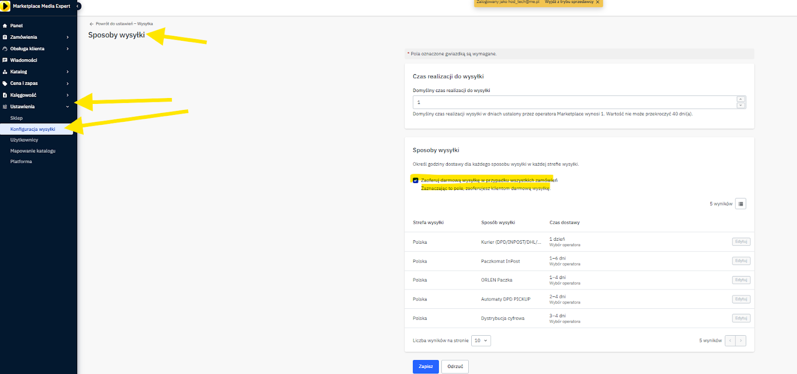 W zakładce Ustawienia → Konfiguracja wysyłki → Sposoby wysyłki masz możliwość zaoferowania darmowej dostawy dla wszystkich zamówień.