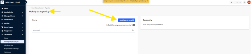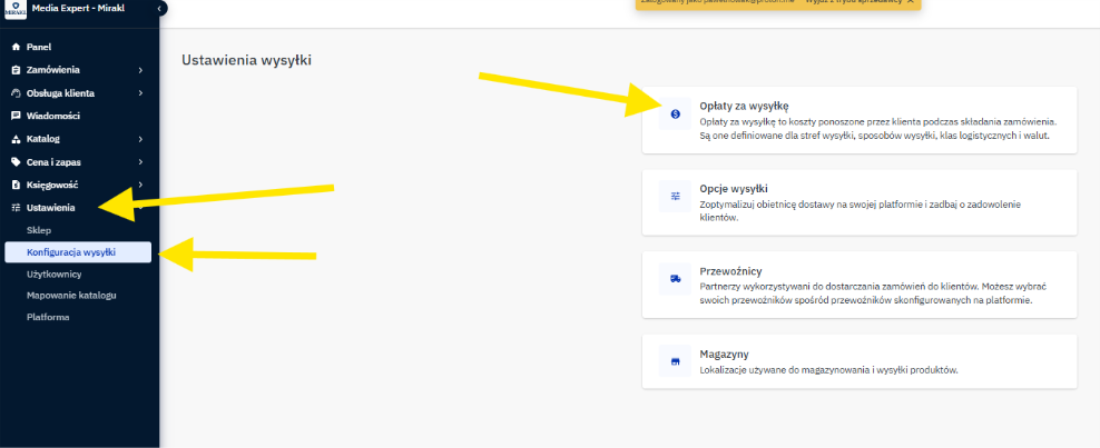 W Panelu Sprzedawcy Media Expert przejdź do zakładki: Ustawienia -> Konfiguracja wysyłki -> Opłaty za wysyłkę