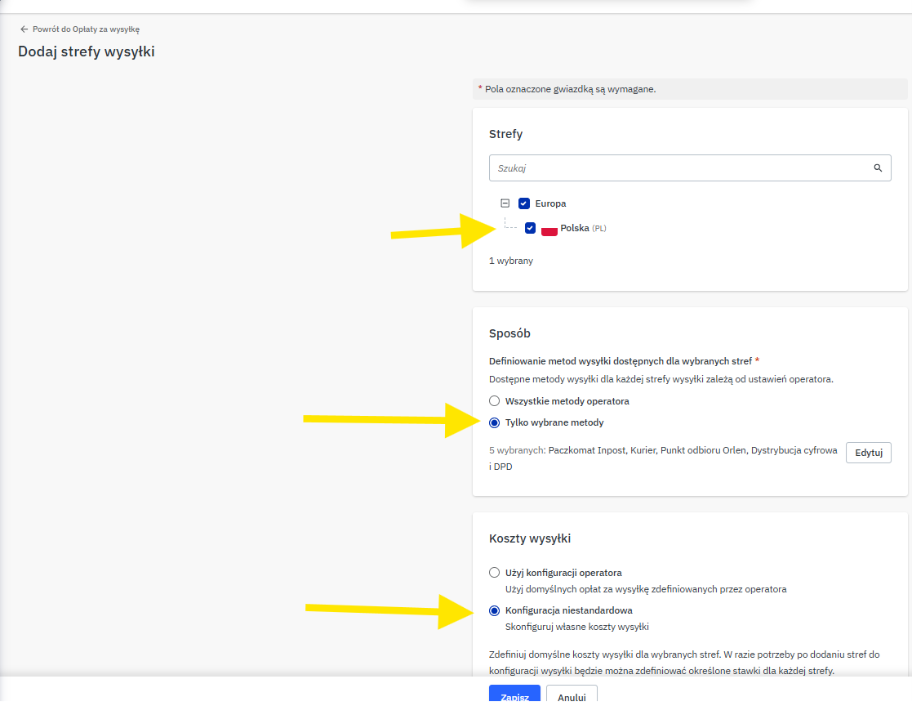 Dodaj strefę “Polska”, a następnie wybierz “Tylko wybrane metody”, aby określić, które formy wysyłki chcesz udostępnić klientom. Następnie w sekcji “Koszty wysyłki” wybierz “Konfigurację niestandardową” i wpisz domyślną cenę wysyłki.