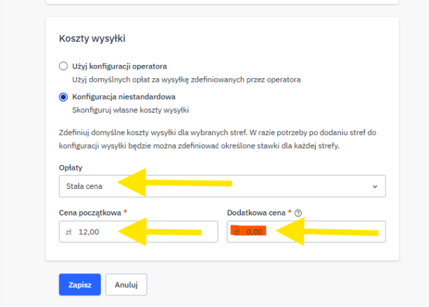 W polu „Cena początkowa” wpisz podstawowy koszt wysyłki, a w polu „Dodatkowa cena” określ, czy chcesz doliczać kwotę X za każdą kolejną sztukę dodaną do paczki jako dodatkowy koszt dostawy.