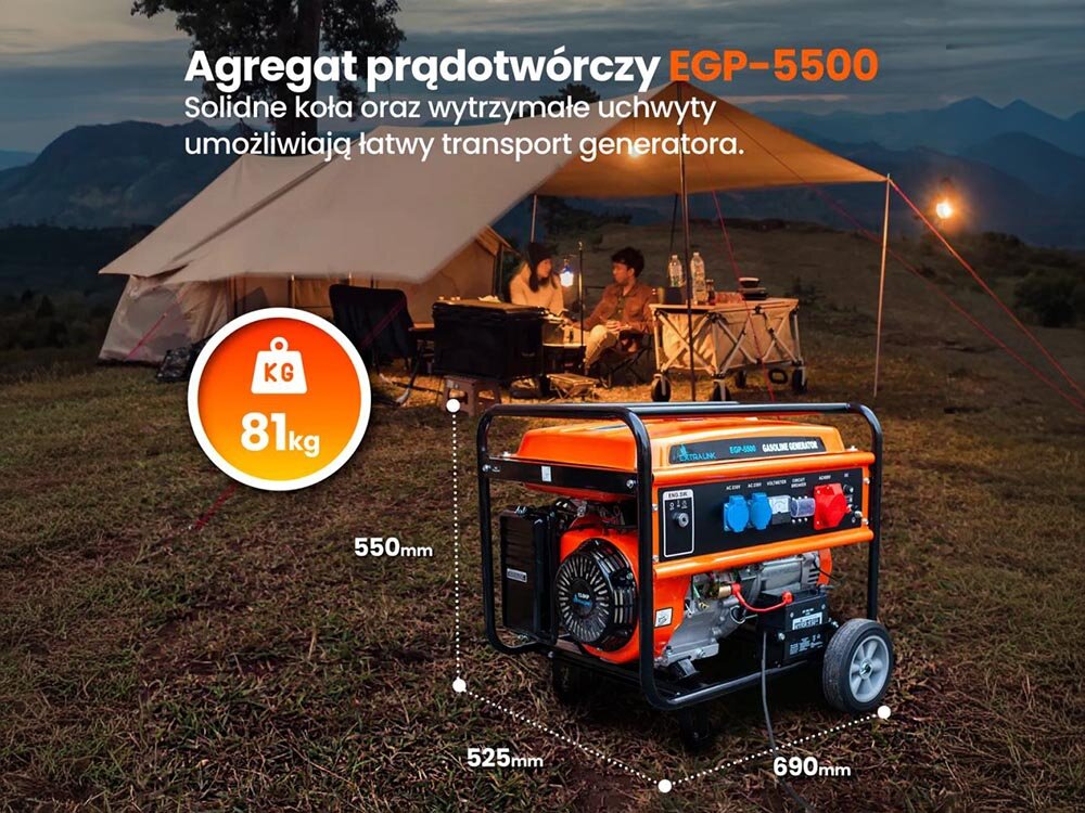 Agregat prądotwórczy EGP-5500 marki EXTRALINK to gwarancja źródła prądu wszędzie tam, gdzie nie ma do niego stałego dostępu. Nadaje się on do użytku zarówno na działce, kempingu czy placu budowy, jak również w domu – jako zasilanie zastępcze w przypadku awarii prądu lub jego zaniku.