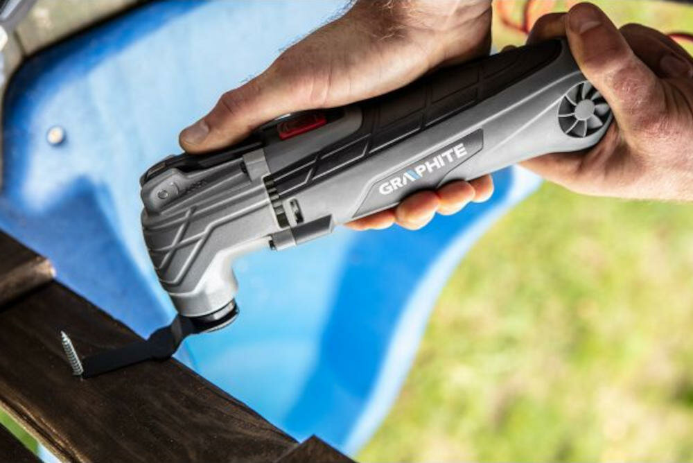 Poznaj urządzenie wielofunkcyjne marki GRAPHITE. Jest to wysokiej klasy produkt z 6 wymiennymi końcówkami roboczymi, przeznaczonymi do cięcia, szlifowania lub skrobania materiałów takich jak: metal, drewno czy ceramika. Urządzenie o mocy 300W posiada ogromną ilość zastosowań, jedynym ograniczeniem jest jedynie Twoja wyobraźnia! Głowica urządzenia wykonuje od 15000 do 21000 oscylacji w ciągu minuty, a kąt oscylacji to 2.8°. Niewielkie i poręczne narzędzie wyposażone jest w możliwość regulacji obrotów.
