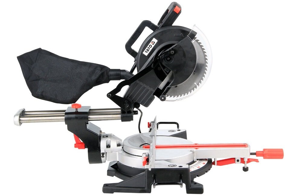 Piła ukosowa posiada silnik o dużej mocy 1800 W i wysokiej trwałości, precyzyjną przekładnię oraz aluminiową osłonę tarczy tnącej. Stabilna metalowa podstawa wyposażona jest w uchwyty transportowe oraz elementy unieruchamiające cięty materiał. Specjalna konstrukcja ramion wysuwanych zapewnia precyzję i komfort pracy. Czytelna podziałka kątowa i zapadkowy mechanizm blokujący zapewniają czyste cięcie w każdym położeniu. Pilarka ukosowa YATO YT-82171 posiada elastyczny kabel gumowy oraz worek na wióry, który zapewnia czyste powietrze na stanowisku pracy.