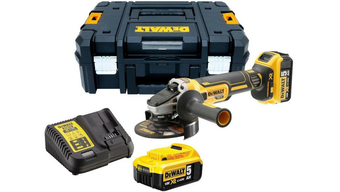 Szlifierka kątowa akumulatorowa DEWALT DCG405P2 + Zestaw startowy (2x aku 5Ah, ładowarka) + walizka + osprzęt