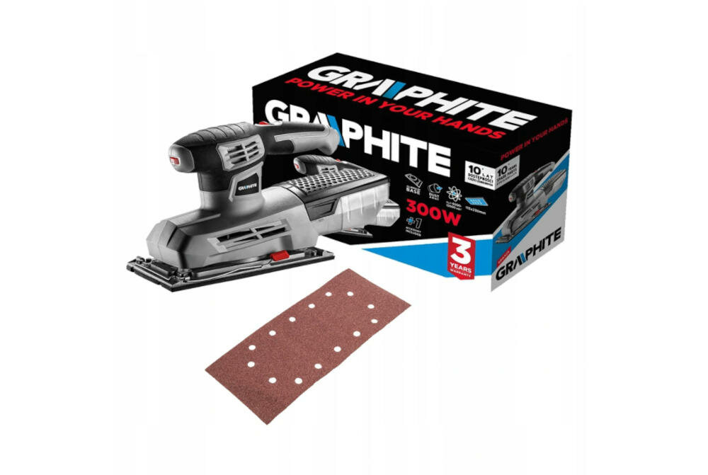 Poznaj wysokiej jakości szlifierkę oscylacyjną, marki GRAPHITE - o mocy 300 W. Przeznaczona jest do obróbki powierzchni drewnianych. Urządzenie, dzięki ergonomicznej konstrukcji oraz odpowiedniemu wyważeniu, zapewnia wysoki komfort podczas pracy. Wymiary stopy szlifierskiej: 115x230 mm. Włącznik szlifierki wyposażony jest w funkcję blokady do pracy ciągłej. Szlifierka posiada możliwość płynnej regulacji obrotów. Prędkość obrotowa szlifierki bez obciążenia wynosi od 6000 do 12000 min⁻¹, liczba oscylacji na biegu jałowym od 12000 do 24000 min⁻¹. Amplituda oscylacji to 2 mm.
