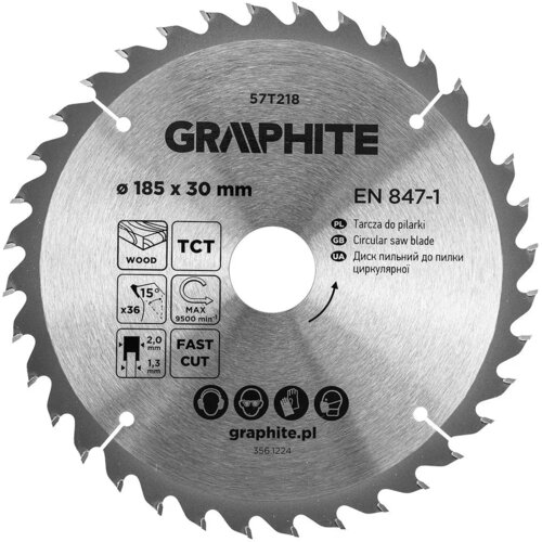 Tarcza do cięcia marki GRAPHITE 185 × 30 mm, 36 zębów, wykonana z wysokiej jakości węglika spiekanego, przeznaczona do szybkiego i czystego cięcia drewna oraz materiałów drewnopochodnych. Odpowiednia liczba zębów umożliwia sprawne cięcia z zachowaniem dobrej jakości wykończenia. W zestawie znajdują się trzy pierścienie redukcyjne (30/25,4 mm, 30/20 mm i 30/16 mm), które umożliwiają dopasowanie tarczy do większości popularnych modeli pilarek.