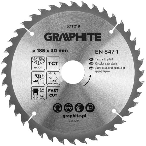 Tarcza do cięcia marki GRAPHITE 185 × 30 mm, 40 zębów, wykonana z wysokiej jakości węglika spiekanego, przeznaczona do szybkiego i czystego cięcia drewna oraz materiałów drewnopochodnych. Odpowiednia liczba zębów umożliwia sprawne cięcia z zachowaniem dobrej jakości wykończenia. W zestawie znajdują się trzy pierścienie redukcyjne (30/25,4 mm, 30/20 mm i 30/16 mm), które umożliwiają dopasowanie tarczy do większości popularnych modeli pilarek.