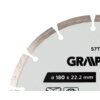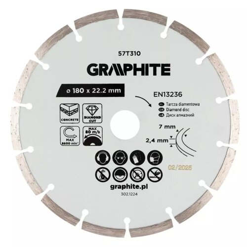Tarcza diamentowa GRAPHITE to narzędzie przeznaczone do precyzyjnego cięcia na sucho materiałów takich jak cegła, kamień, beton, granit czy marmur. Dzięki segmentowej krawędzi tnącej oraz średnicy 180 mm i otworowi montażowemu 22,2 mm (z dołączonym pierścieniem redukcyjnym), tarcza zapewnia skuteczność pracy nawet przy maksymalnej prędkości obrotowej wynoszącej 8 600 obr./min (80 m/s). Segment tnący o wysokości 7 mm i szerokości 2,4 mm gwarantuje precyzyjne cięcia. Produkt marki GRAPHITE spełnia normę EN 13236, potwierdzając jego bezpieczeństwo.