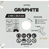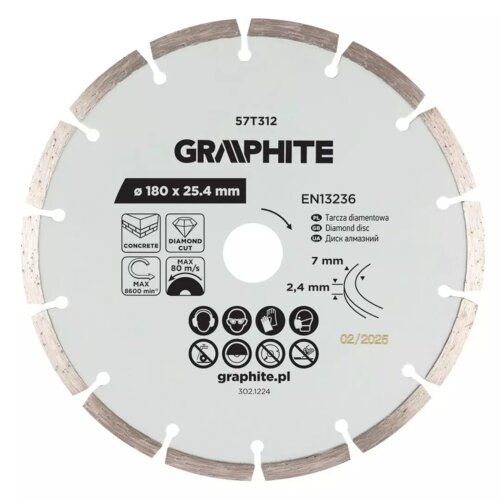 Tarcza diamentowa GRAPHITE to narzędzie przeznaczone do precyzyjnego cięcia na sucho materiałów takich jak cegła, kamień, beton, granit czy marmur. Dzięki segmentowej krawędzi tnącej oraz średnicy 180 mm i otworowi montażowemu 25,4 mm (z dołączonym pierścieniem redukcyjnym), tarcza zapewnia skuteczność pracy nawet przy maksymalnej prędkości obrotowej wynoszącej 8 600 obr./min (80 m/s). Segment tnący o wysokości 7 mm i szerokości 2,4 mm gwarantuje precyzyjne cięcia. Produkt marki GRAPHITE spełnia normę EN 13236, potwierdzając jego bezpieczeństwo.