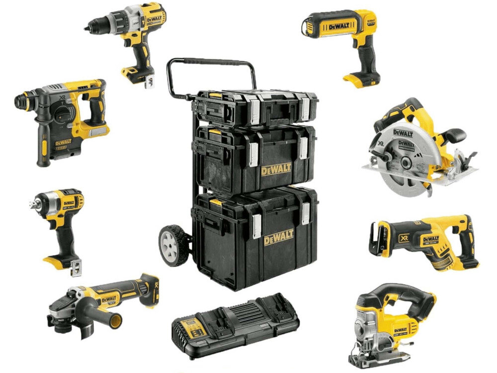Zestaw DEWALT DCK854P4 to komplet elektronarzędzi wręcz stworzony dla prawdziwych majsterkowiczów. Składa się on z wiertarko-wkrętarki DCD996, zakrętarki udarowej DCF880, pilarki tarczowej DCS570, pilarki szablastej DCS367, młotowiertarki DCH273, a także wyrzynarki DCS331, szlifierki kątowej DCG405 oraz latarki DCL050. Wszystkie urządzenia zasilane są za pomocą akumulatora. Zestaw DEWALT DCK854P4 to pakiet urządzeń gwarantujący wydajność, niezawodność, komfort pracy i przede wszystkim niezależność od zasilania sieciowego.