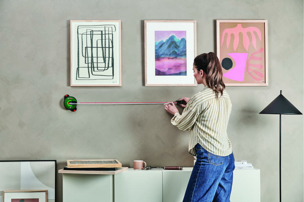 Urządzenia możesz używać do różnego rodzaju prac, np. wyrównywania lub wieszania obrazów i półek, mocowania wieszaków i uchwytów lub aranżacji elementów dekoracyjnych. Możesz wyrównać i zamocować także lustro i telewizor.