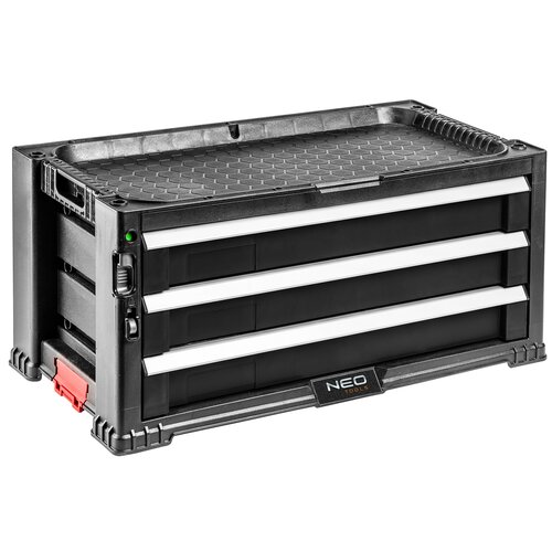 Szafka narzędziowa marki NEO to praktyczna i solidna szafka o modułowej budowie, wyposażona w 3 szuflady. Budowa ta umożliwia bardzo łatwe i szybkie łączenie ze sobą kolejnych modułów co znacznie zwiększa jej użyteczność. Szafka wyposażona jest w dodatkowe pojemniki co podnosi komfort pracy. Szuflady posiadają blokadę oraz miejsce na kłódkę co podnosi bezpieczeństwo narzędzi.